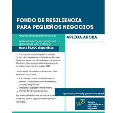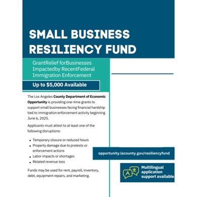 The Los Angeles County Department of Economic Opportunity has opened the Small Business Resiliency Fund, providing up to $5,000 in grants to businesses impacted by immigration enforcement actions since June 2025. Eligible businesses in Los Angeles County can apply by October 31, 2025, at 5:00 p.m., with BizCare available to assist with applications. For more information, please click here.
