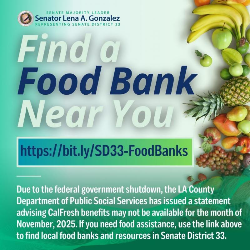 Due to the federal government shutdown, the LA County Department of Public Social Services has issued a statement advising CalFresh benefits may not be available for the month of November, 2025. If you need food assistance, use the link above to find local food banks and resources in Senate District 33.